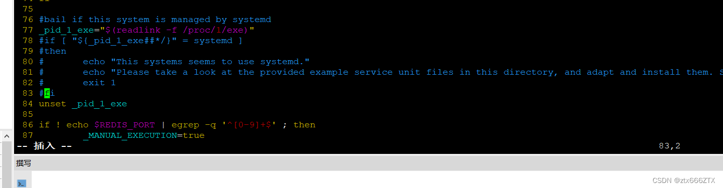 [root@localhost redis-6.2.7]# ./utils/install_server.sh #执行会报错Welcome to the redis service installerThis script will help you easily set up a running redis serverThis systems seems to use systemd.Please take a look at the provided example service unit files in this directory, and adapt and install them. Sorry![root@localhost redis-6.2.7]# vim ./utils/install_server.sh将77行到83行内容全部注释[root@localhost redis-6.2.7]# ln -s /usr/local/redis/bin/* /usr/local/bin/ #将redis执行放入到PATH变量的搜索路径中,从而就可以直接执行里面的命令