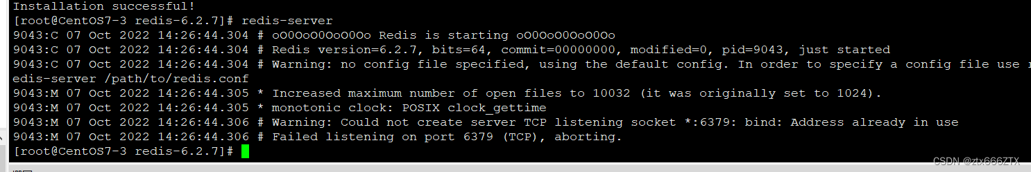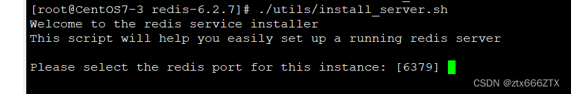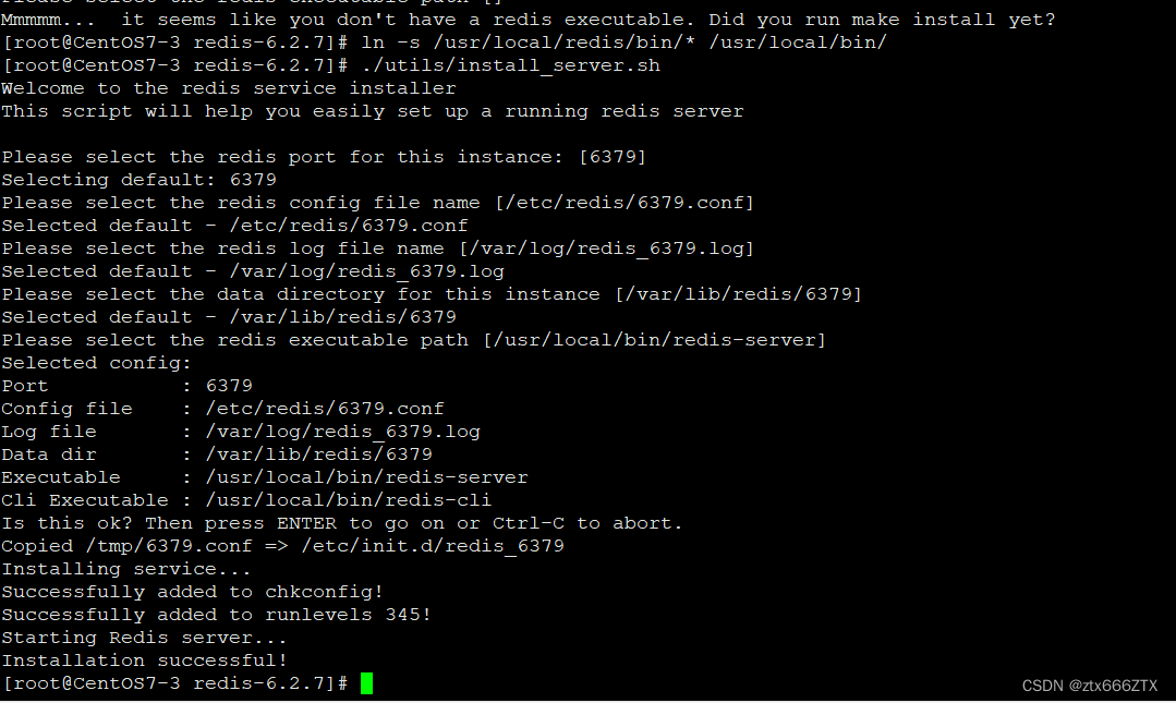[root@localhost redis-6.2.7]# ./utils/install_server.sh #一路回车Welcome to the redis service installerThis script will help you easily set up a running redis serverPlease select the redis port for this instance: [6379]Selecting default: 6379Please select the redis config file name [/etc/redis/6379.conf]Selected default - /etc/redis/6379.confPlease select the redis log file name [/var/log/redis_6379.log]Selected default - /var/log/redis_6379.logPlease select the data directory for this instance [/var/lib/redis/6379]Selected default - /var/lib/redis/6379Please select the redis executable path [/usr/local/bin/redis-server]Selected config:Port : 6379Config file : /etc/redis/6379.conf #redis服务器的主配置文件Log file : /var/log/redis_6379.log #日志文件Data dir : /var/lib/redis/6379 #数据库存放目录Executable : /usr/local/bin/redis-server #服务器执行文件Cli Executable : /usr/local/bin/redis-cliIs this ok? Then press ENTER to go on or Ctrl-C to abort.Copied /tmp/6379.conf => /etc/init.d/redis_6379Installing service...Successfully added to chkconfig!Successfully added to runlevels 345!Starting Redis server...Installation successful!