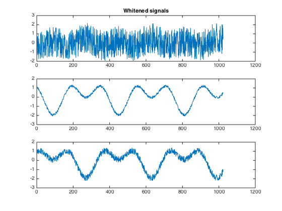 我们希望将他们分解开,这时就该ICA出场了。但在ICA之前,往往会对数据有一个预处理过程,那就是PCA与白化。白化在这里先不提,PCA本质上来说就是一个降维过程,大大降低ICA的计算量。PCA,白化后的结果如下图所示。可以看到,原先的6路信号减少为3路,ICA仅需要这3路混合信号即可还原源信号。