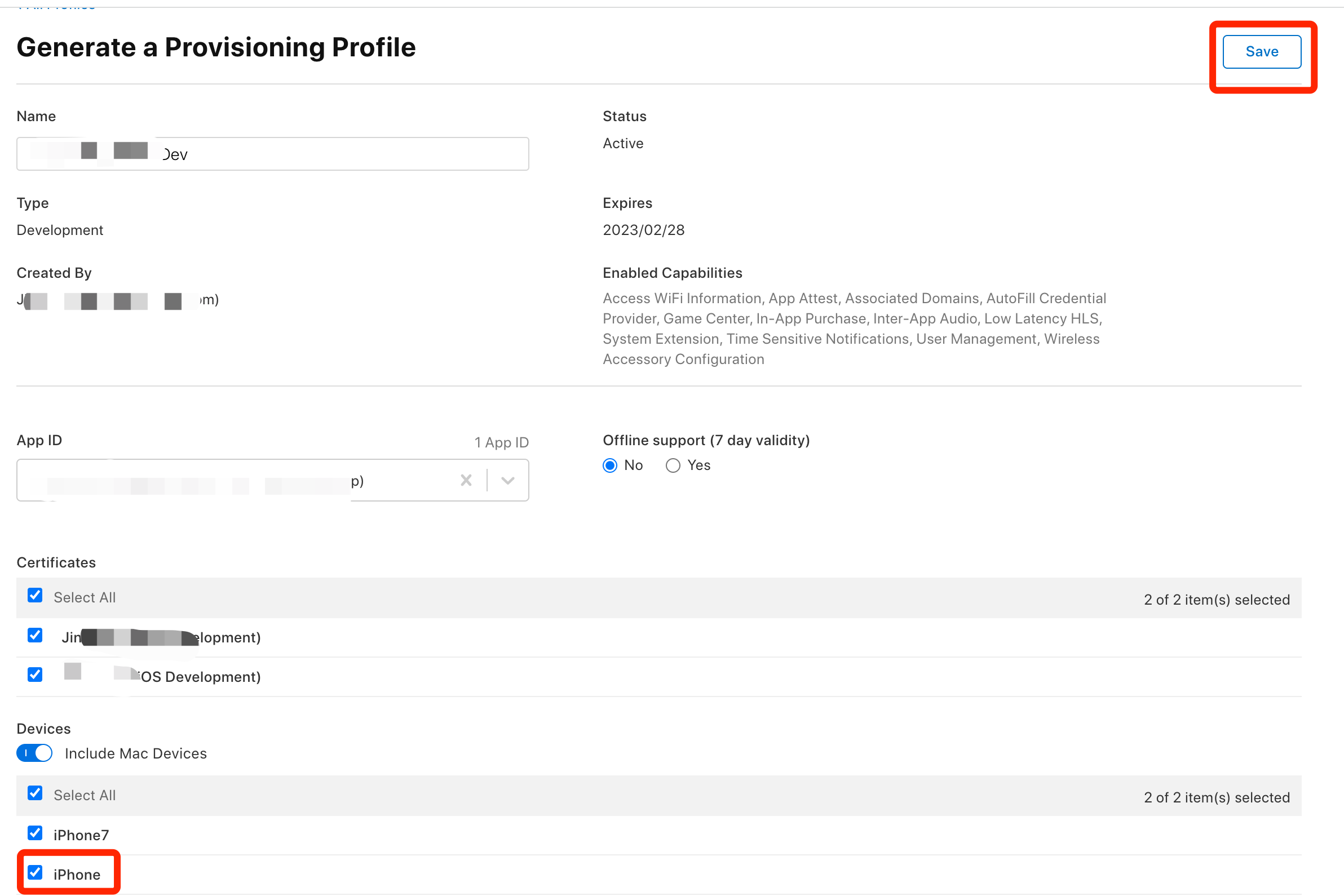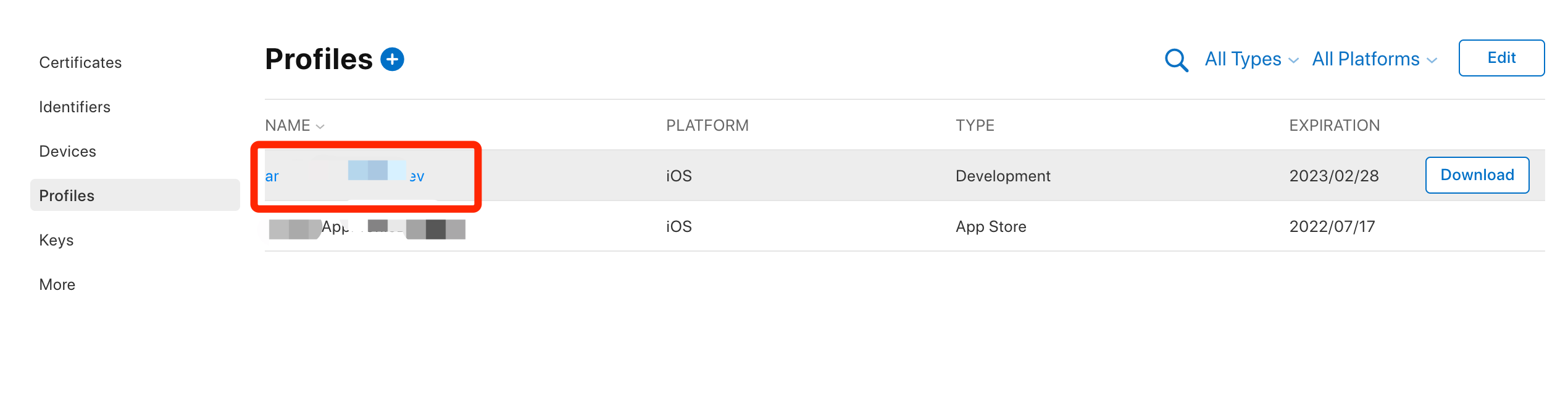 3.设备添加完毕后 在列表中选择Profiles -> 点击我们的dev证书