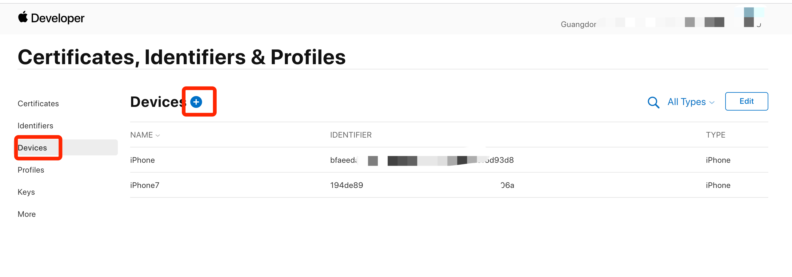 从开发者中心进入,配置添加测试设备的udid,并重新下载配置文件