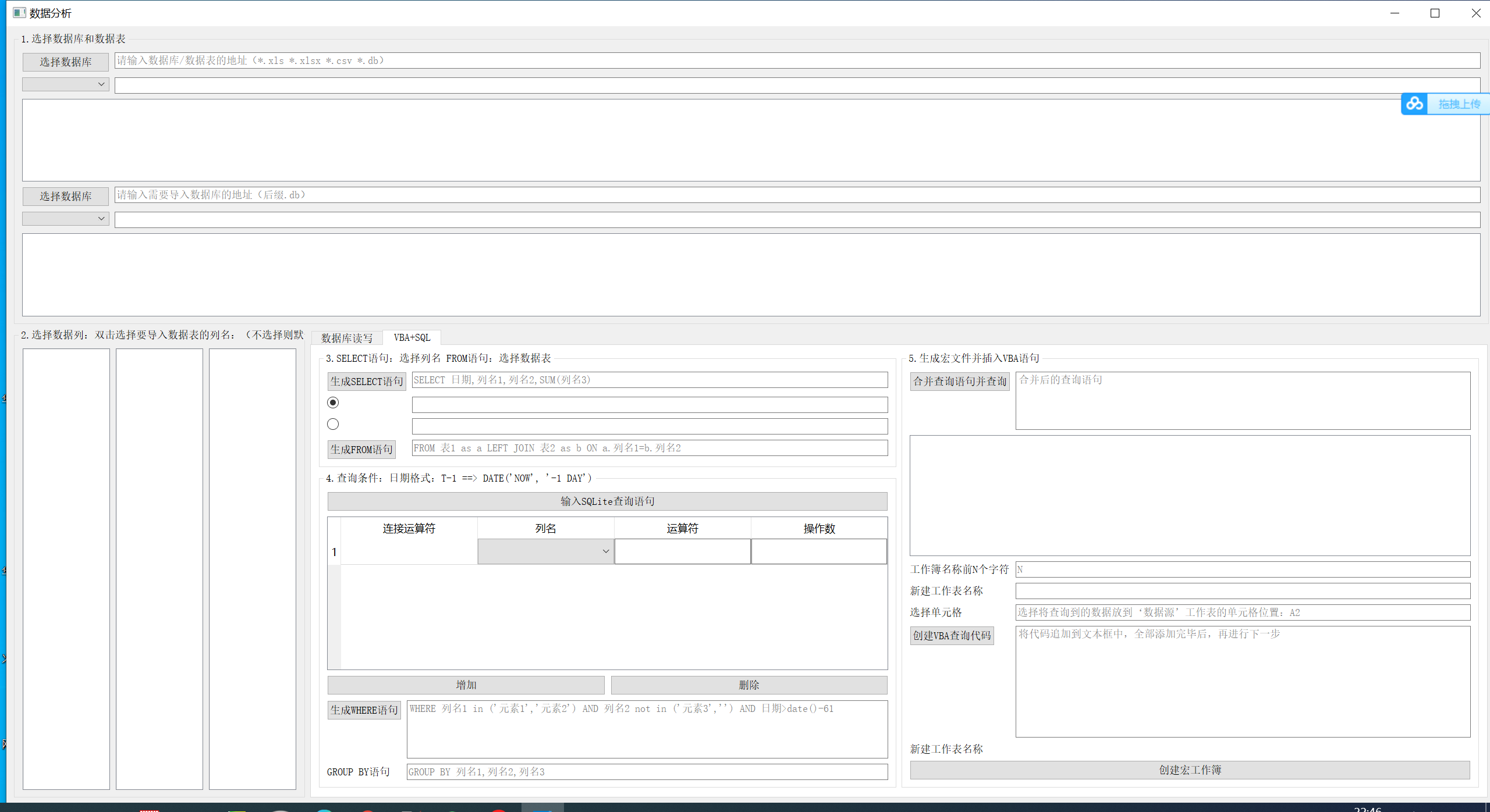 #!/usr/bin/env python # -*- coding:utf-8 -*- # @FileName :UI.py # @Time :2022/3/8 14:45 # @Author :ziqihualai import datetime import os import re import sqlite3 import sys import chardet import numpy as np import pandas as pd import qdarkstyle as qdarkstyle import win32com.client import xlrd from PyQt5 import QtWidgets from PyQt5.QtCore import Qt from PyQt5.QtGui import QIcon, QStandardItemModel, QFont, QBrush from PyQt5.QtWidgets import QWidget, QVBoxLayout, QLabel, QGridLayout, QLineEdit, QHBoxLayout, \ QPushButton, QComboBox, QFormLayout, QGroupBox, QTabWidget, QListWidget, QStackedWidget, QMessageBox, QStatusBar, \ QAbstractItemView, QHeaderView, QListWidgetItem, QTableWidget, QTableWidgetItem, QFileDialog, QPlainTextEdit, \ QDialog, QRadioButton, QMainWindow, QApplication, QCheckBox, QTreeWidget, QTreeWidgetItem class MainWindow(QMainWindow): def __init__(self, parent=None): super(MainWindow, self).__init__(parent) self.setup_ui() def setup_ui(self): self.setObjectName("MainWindow") # 对象名称(objectName):首字母大写 self.resize(QApplication.desktop().width(), QApplication.desktop().height() - 100) # 设置窗口尺寸 self.setWindowTitle('数据分析') # 窗口标题(windowSystemTitle): self.setWindowIcon(QIcon('th.png')) # 应用图标(windowIcon): self.main_widget = QWidget() self.tab_widget = QTabWidget() self.db_widget = QWidget() self.hlayout_1 = QHBoxLayout() self.hlayout_1.addWidget(self.create_db_groupbox()) self.hlayout_1.addWidget(self.write_into_db_groupbox()) self.db_widget.setLayout(self.hlayout_1) self.db_vba_widget = QWidget() self.glayout_1 = QGridLayout() self.glayout_1.addWidget(self.select_from_groupbox(), 0, 0, 1, 1) self.glayout_1.addWidget(self.condition_groupbox(), 1, 0, 1, 1) self.glayout_1.addWidget(self.vba_groupbox(), 0, 1, 2, 1) self.db_vba_widget.setLayout(self.glayout_1) self.tab_widget.addTab(self.db_widget, "数据库读写") self.tab_widget.addTab(self.db_vba_widget, "VBA+SQL") self.glayout = QGridLayout() self.glayout.addWidget(self.select_table_groupbox(), 0, 0, 1, 3) self.glayout.addWidget(self.select_cols_groupbox(), 1, 0, 1, 1) self.glayout.addWidget(self.tab_widget, 1, 1, 1, 2) self.main_widget.setLayout(self.glayout) self.setCentralWidget(self.main_widget) def init_status(self): self.sBar = QStatusBar() self.setStatusBar(self.sBar) # 选择数据库及数据表 def select_table_groupbox(self): self.select_table_groupbox = QGroupBox("1.选择数据库和数据表") self.select_table_groupbox.setMaximumHeight(500) self.data_path_btn1 = QPushButton("选择数据库") self.data_path_btn1.setMinimumWidth(150) self.data_path_edit1 = QLineEdit() self.data_path_edit1.setPlaceholderText("请输入数据库/数据表的地址(*.xls *.xlsx *.csv *.db)") self.table_combo1 = QComboBox() self.table_combo1.setMinimumWidth(150) self.table_edit1 = QLineEdit() self.data_path_btn1.clicked.connect( lambda: on_select_data(self.data_path_edit1, self.table_combo1)) self.data_path_btn1.clicked.connect( lambda: on_get_data(self.data_path_edit1, self.table_combo1, self.table_edit1, self.tablewidget_1, self.listwidget_1, self.listwidget)) self.table_combo1.activated.connect( lambda: on_get_data(self.data_path_edit1, self.table_combo1, self.table_edit1, self.tablewidget_1, self.listwidget_1, self.listwidget)) self.data_path_btn2 = QPushButton("选择数据库") self.data_path_btn2.setMinimumWidth(150) self.data_path_edit2 = QLineEdit() self.data_path_edit2.setPlaceholderText("请输入需要导入数据库的地址(后缀.db)") self.table_combo2 = QComboBox() self.table_combo2.setMinimumWidth(150) self.table_edit2 = QLineEdit() self.data_path_btn2.clicked.connect( lambda: on_select_data(self.data_path_edit2, self.table_combo2)) self.data_path_btn2.clicked.connect( lambda: on_get_data(self.data_path_edit2, self.table_combo2, self.table_edit2, self.tablewidget_2, self.listwidget_2, self.listwidget)) self.table_combo2.activated.connect( lambda: on_get_data(self.data_path_edit2, self.table_combo2, self.table_edit2, self.tablewidget_2, self.listwidget_2, self.listwidget)) self.tablewidget_1 = QTableWidget() # 显示数据源前2行数据 self.tablewidget_1.setMaximumHeight(150) # 禁止编辑 self.tablewidget_1.setEditTriggers(QAbstractItemView.NoEditTriggers) self.tablewidget_1.horizontalHeader().setSectionResizeMode(QHeaderView.Stretch) # 所有列自动拉伸,充满界面 self.tablewidget_2 = QTableWidget() # 显示数据源前2行数据 self.tablewidget_2.setMaximumHeight(150) # 禁止编辑 self.tablewidget_2.setEditTriggers(QAbstractItemView.NoEditTriggers) self.tablewidget_2.horizontalHeader().setSectionResizeMode(QHeaderView.Stretch) # 所有列自动拉伸,充满界面 self.flayout = QFormLayout() self.flayout.addRow(self.data_path_btn1, self.data_path_edit1) self.flayout.addRow(self.table_combo1, self.table_edit1) self.flayout.addRow(self.tablewidget_1) self.flayout.addRow(self.data_path_btn2, self.data_path_edit2) self.flayout.addRow(self.table_combo2, self.table_edit2) self.flayout.addRow(self.tablewidget_2) self.select_table_groupbox.setLayout(self.flayout) return self.select_table_groupbox # 选择数据列 def select_cols_groupbox(self): self.select_cols_groupbox = QGroupBox("""2.选择数据列:双击选择要导入数据表的列名:(不选择则默认全部导入)""") self.select_cols_groupbox.setMaximumWidth(500) self.listwidget_1 = QListWidget() # 显示数据源表头 self.listwidget_1.setFixedWidth(150) self.listwidget_2 = QListWidget() # 显示数据源表头 self.listwidget_2.setFixedWidth(150) self.listwidget = QListWidget() # 选择需要的列 self.listwidget.setFixedWidth(150) self.listwidget_1.doubleClicked.connect(lambda: on_change_lv(0, self.listwidget, self.listwidget_1)) self.listwidget_2.doubleClicked.connect(lambda: on_change_lv(0, self.listwidget, self.listwidget_2)) self.listwidget.doubleClicked.connect(lambda: on_change_lv(1, self.listwidget)) self.hlayout_1 = QHBoxLayout() self.hlayout_1.addWidget(self.listwidget_1) self.hlayou