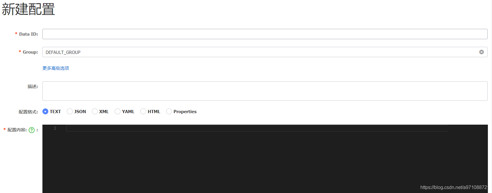 添加一个配置,需要注意Data ID需要是完整的文件名以及后缀,分组可以自己设置,另外需要注意新建的时候选择还新建在哪一个空间: