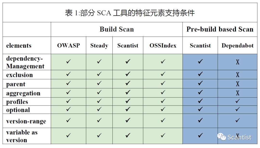 为了验证市场主流工具对build Scan和pre-Build Scan的支持程度,我们对市面上常用的SCA工具进行了对比分析,包括Dependabot Alerts、OWASP Dependency Check、OSS Index、Eclipse Steady及Scantist SCA。