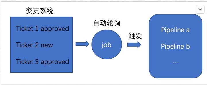 下面是我们流程的示意图,有一个 job 去轮询变更系统,然后将 approve 的 ticket 转发给 pipeline 完成部署: