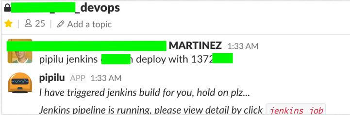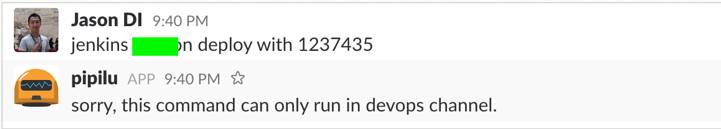 当然如果你的 pipeine 有不同的入口,例如你的团队引入了聊天机器人来帮助团队部署应用,那也一定要明确机器人什么情况下才可以影响部署请求 . 我的做法是只会让机器人在特定的 channel 响应特定人的部署请求,这样方便追踪与管理。