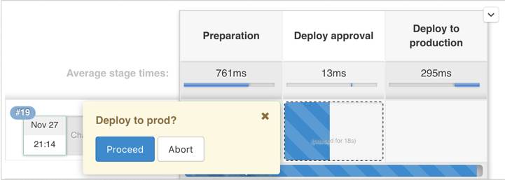 也有同学将 approve 的动作放到了 pipeline 中,如果下图所示,在 pipeline 加了一个 approve 的 stage: