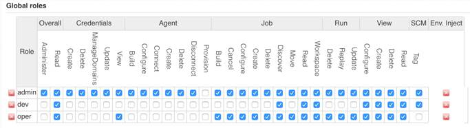 下图是我们的权限管理示例,项目角色与全局角色的区别就是,项目角色只能管理项目,没有管理 jenkins 的权限配置。