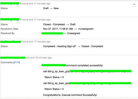 推荐的集中式日志管理工具当然就是 ELK 或者 graylog。下图是我们的一个变更 ticket 的 log 信息。