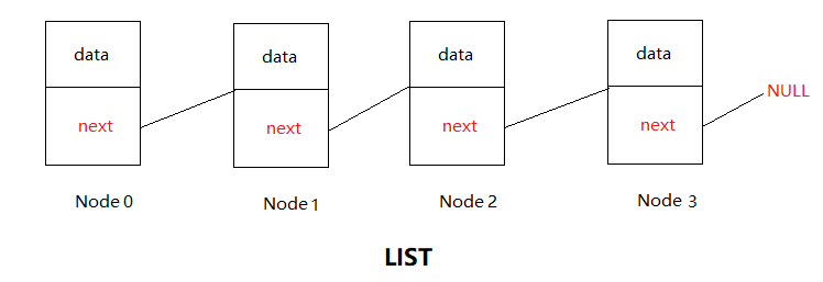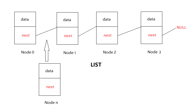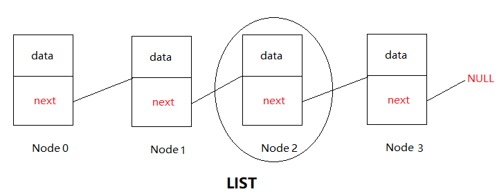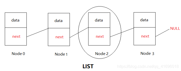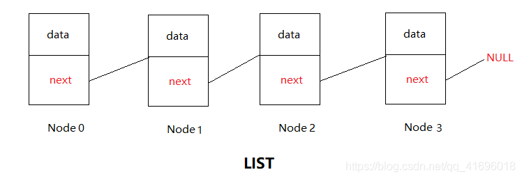 list中每个node通过指针next前后相联系,但要注意list中最后一个node由于没有后续的node,因此其next指正是指向NULL的。