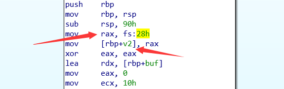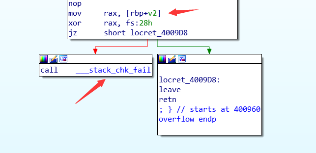 只有 rax 和fs:28h 两个值相等的时候 才能跳转到返回值,反之则调用stack_chk_fail。