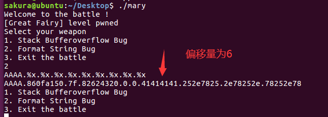 这里我们先输入2进入格式化字符串漏洞的函数,输入aaaa.%x.%x.%x.%x.%x.%x.%x.%x.%x发现偏移量为6。