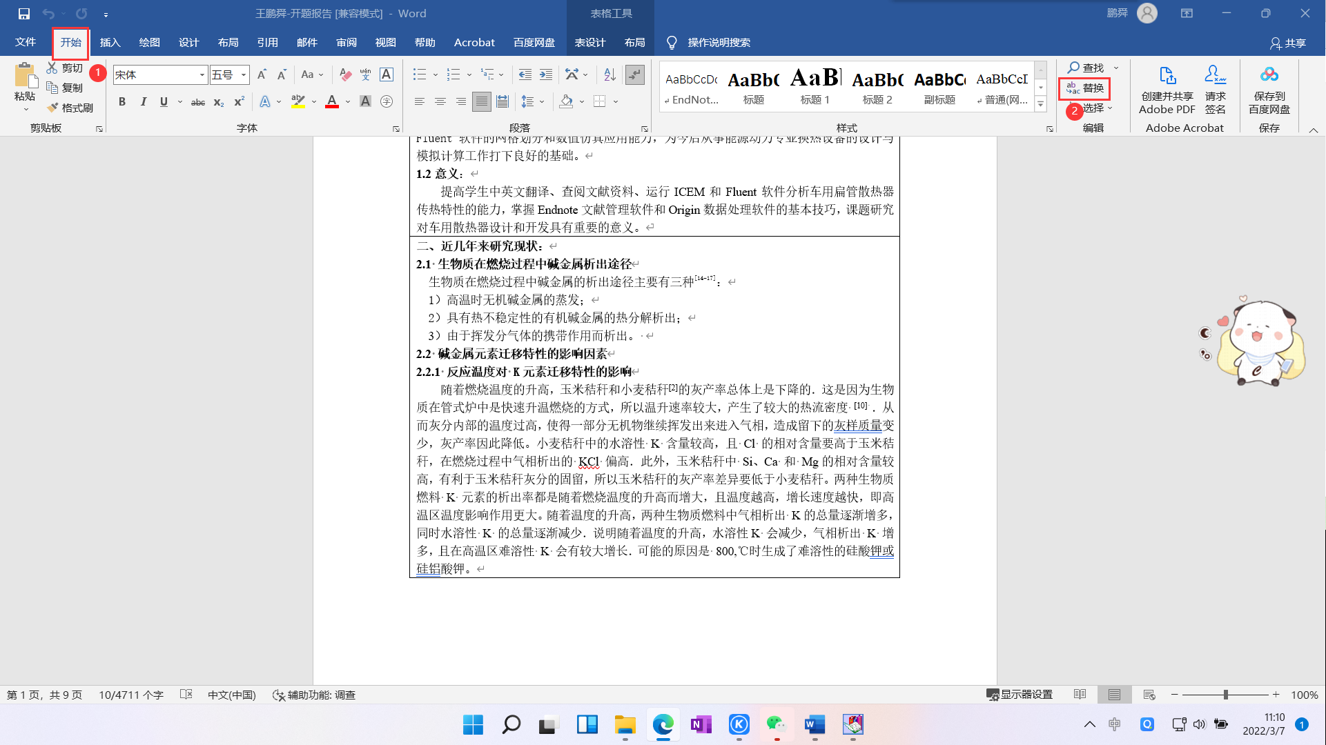 1.打开word文档,点击左上角的“开始”,在开始界面中右侧点击替换。