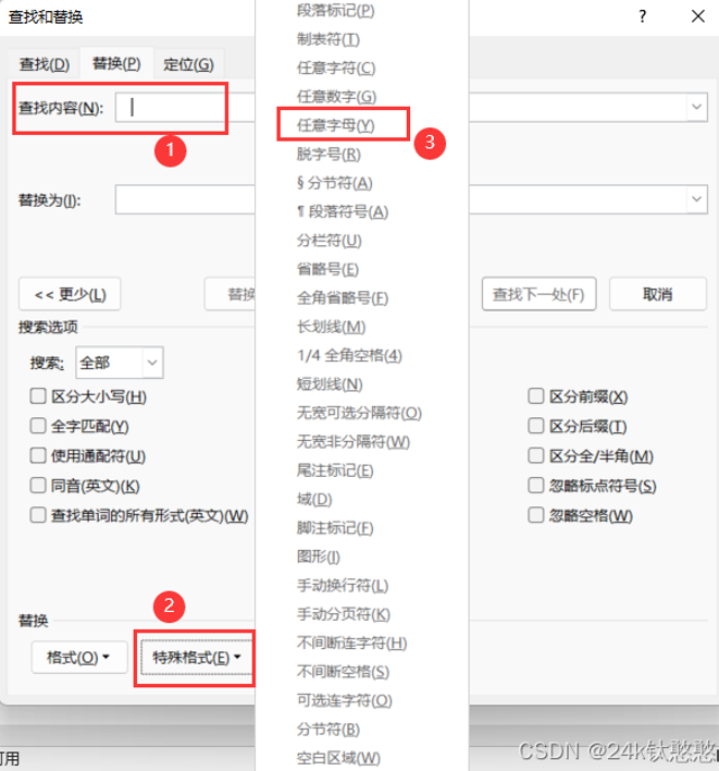3.光标点中“查找内容”,然后点击最下方的“特殊格式”,选择“任意字母”。
