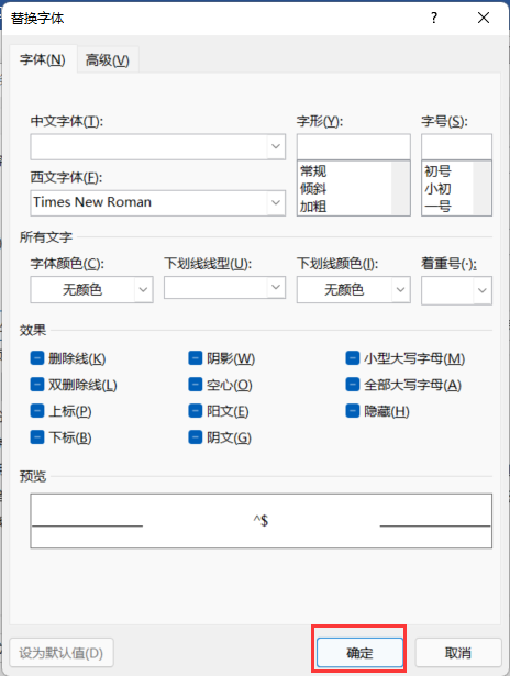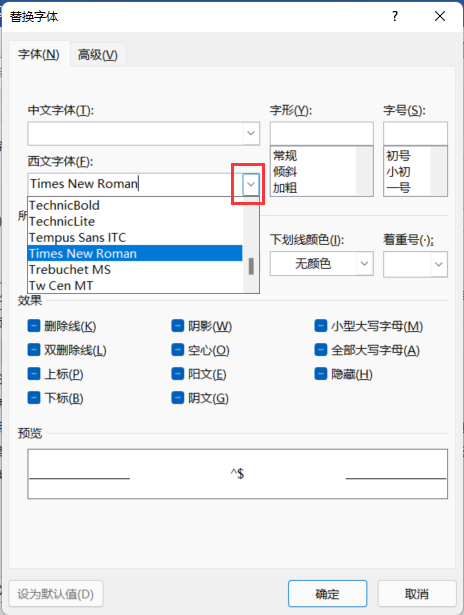 5.在弹出的对话框中,点击西文字体对话框的下拉按钮,选择“Times New Roman”字体,这里可以根据自己的需要选择不同的字体。