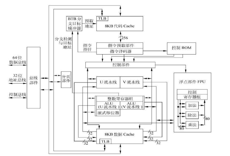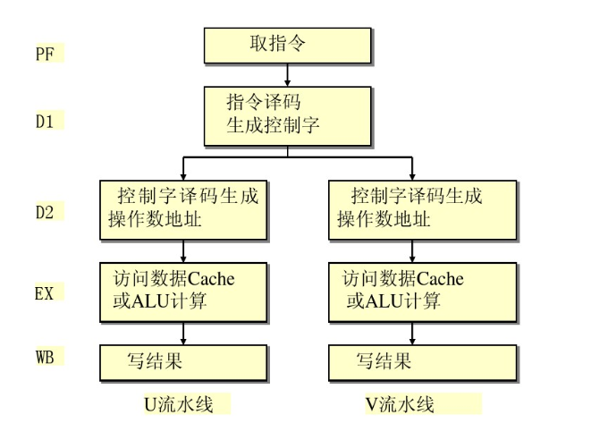 U流水线和V流水线均含有独立的ALU,一系列寄存器,地址生成电路和连接数据Cache存取数据,称为Cache双端接口
