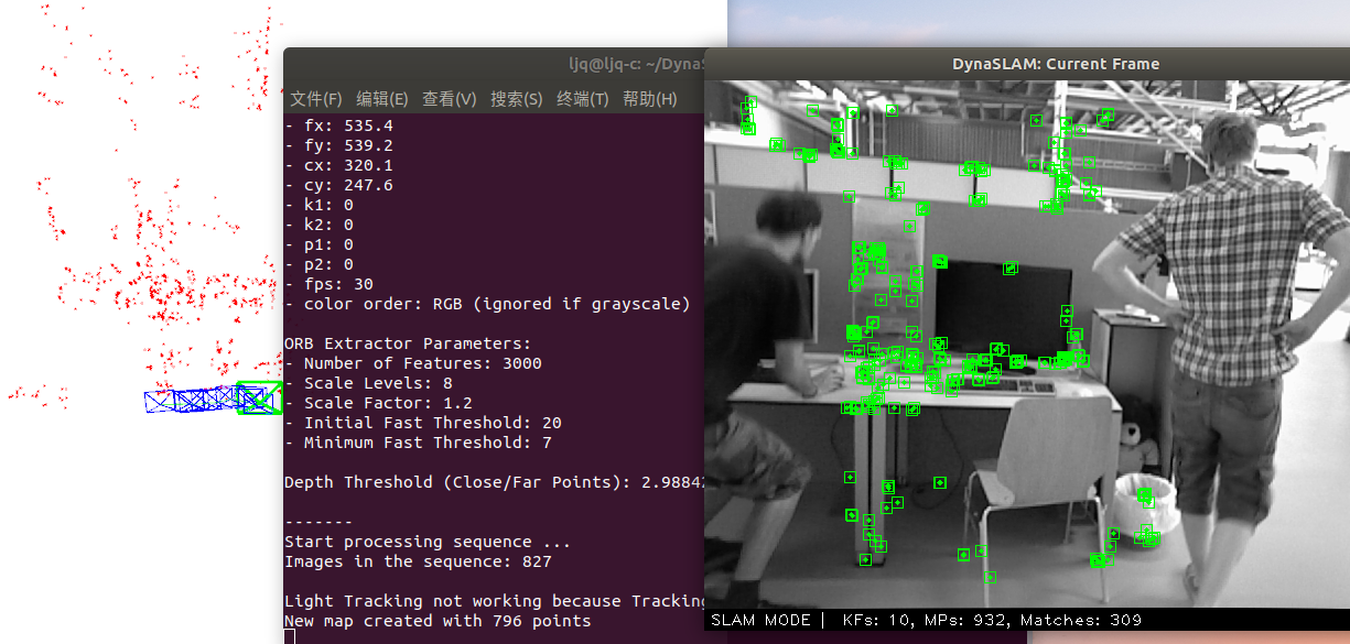 其中maskpath和inpaintedFrame是自己创建的目录,maskpask如果不指定的话就不调用深度学习框架进行动态目标检测,inpaintedFrame如何不指定的话就不进行背景修复,运行中如果出现错误初始化不成功,可以在tum文件中修改(提高)特征点数目(gedit Examples/RGB-D/TUM3.yaml)(默认1000,改为3000)