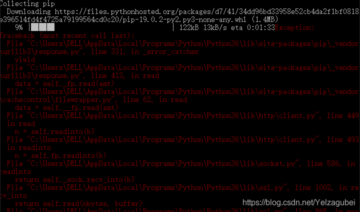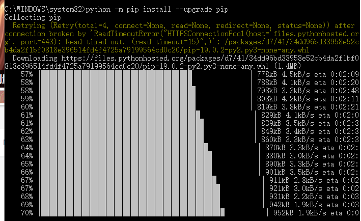 使用‘python -m pip install -upgrade pip’命令更新pip时失败,出现以下画面: