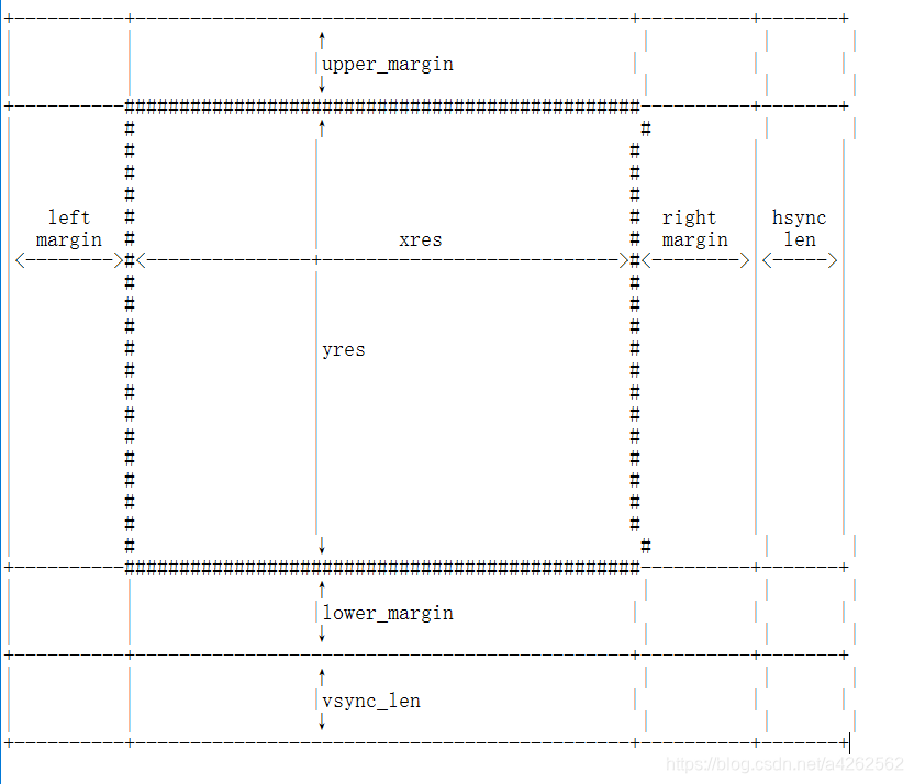 | upper_margin | VFP (Vertical Front Porch) | 从Vsync信号enable起(垂直同步信号开始)到有效的帧数据首行间的无效行数 | |