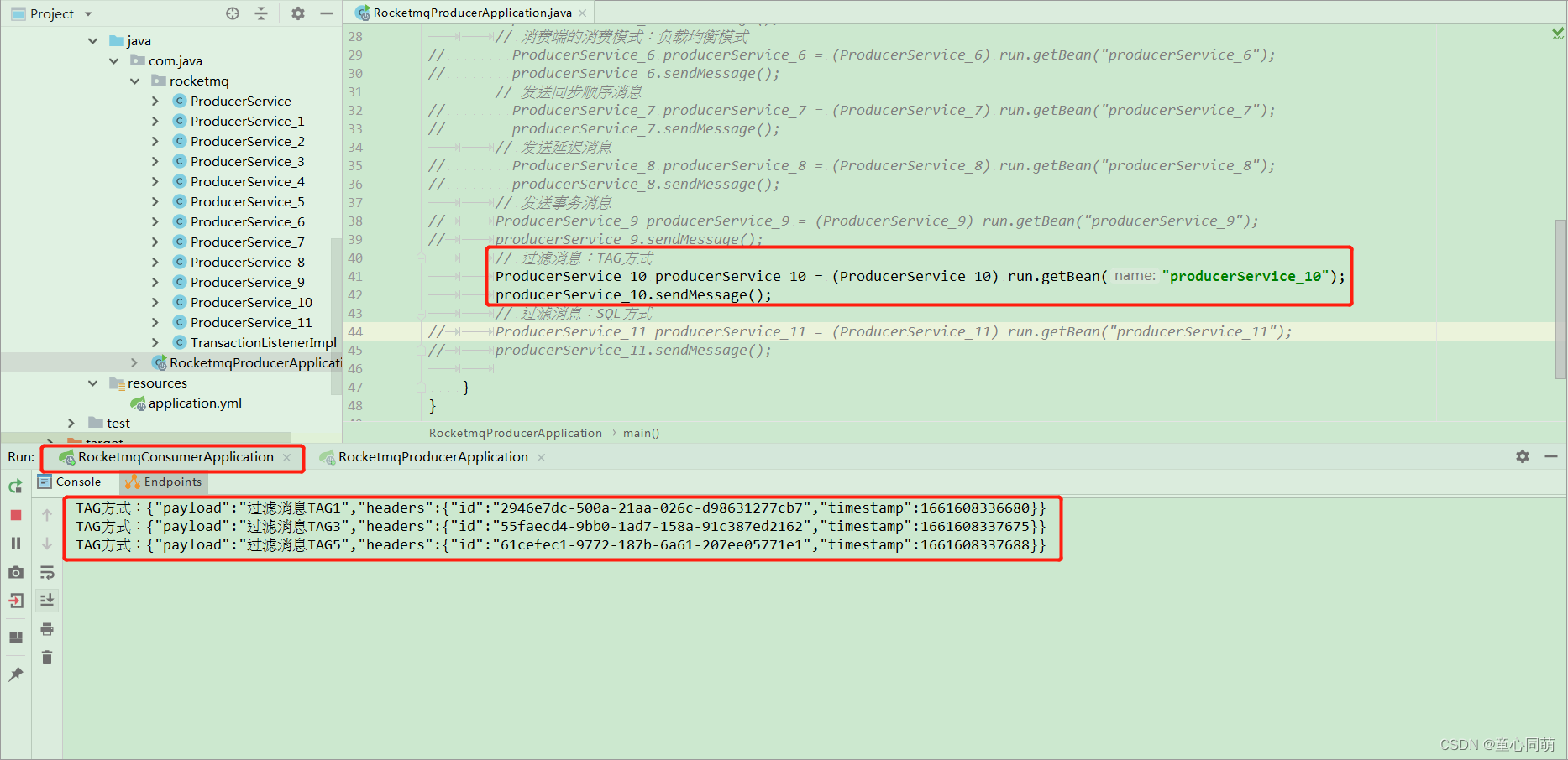 package com.java.rocketmq; import org.apache.rocketmq.spring.core.RocketMQTemplate; import org.springframework.beans.factory.annotation.Autowired; import org.springframework.messaging.Message; import org.springframework.messaging.support.MessageBuilder; import org.springframework.stereotype.Component; /** * 消息生产者service类 过滤消息:TAG方式 * convertAndSend方法destination参数为-->topic:TAG */ @Component("producerService_10") public class ProducerService_10 { @Autowired private RocketMQTemplate rocketMQTemplate; /** * 过滤消息:TAG方式 */ public void sendMessage(){ rocketMQTemplate.convertAndSend("rocketmq_10" + ":" + "TAG1", MessageBuilder.withPayload("过滤消息TAG1").build()); rocketMQTemplate.convertAndSend("rocketmq_10" + ":" + "TAG2", MessageBuilder.withPayload("过滤消息TAG2").build()); rocketMQTemplate.convertAndSend("rocketmq_10" + ":" + "TAG3", MessageBuilder.withPayload("过滤消息TAG3").build()); rocketMQTemplate.convertAndSend("rocketmq_10" + ":" + "TAG4", MessageBuilder.withPayload("过滤消息TAG4").build()); rocketMQTemplate.convertAndSend("rocketmq_10" + ":" + "TAG5", MessageBuilder.withPayload("过滤消息TAG5").build()); rocketMQTemplate.convertAndSend("rocketmq_10" + ":" + "TAG6", MessageBuilder.withPayload("过滤消息TAG6").build()); } }package com.java.rocketmq; import org.apache.rocketmq.spring.annotation.MessageModel; import org.apache.rocketmq.spring.annotation.RocketMQMessageListener; import org.apache.rocketmq.spring.annotation.SelectorType; import org.apache.rocketmq.spring.core.RocketMQListener; import org.springframework.stereotype.Component; /** * 消息消费者service类 过滤消息:TAG方式 * selectorType = SelectorType.TAG为TAG方式接收消息 * selectorExpression = "TAG1 || TAG2"根据TAG指定需要消费的消息 */ @RocketMQMessageListener(topic = "rocketmq_10",consumerGroup = "${rocketmq.consumer.group_10}",selectorType = SelectorType.TAG,selectorExpression = "TAG1 || TAG3 || TAG5") @Component public class ConsumerService_10 implements RocketMQListener<String> { @Override public void onMessage(String message) { System.out.println("TAG方式:"+message); } }
