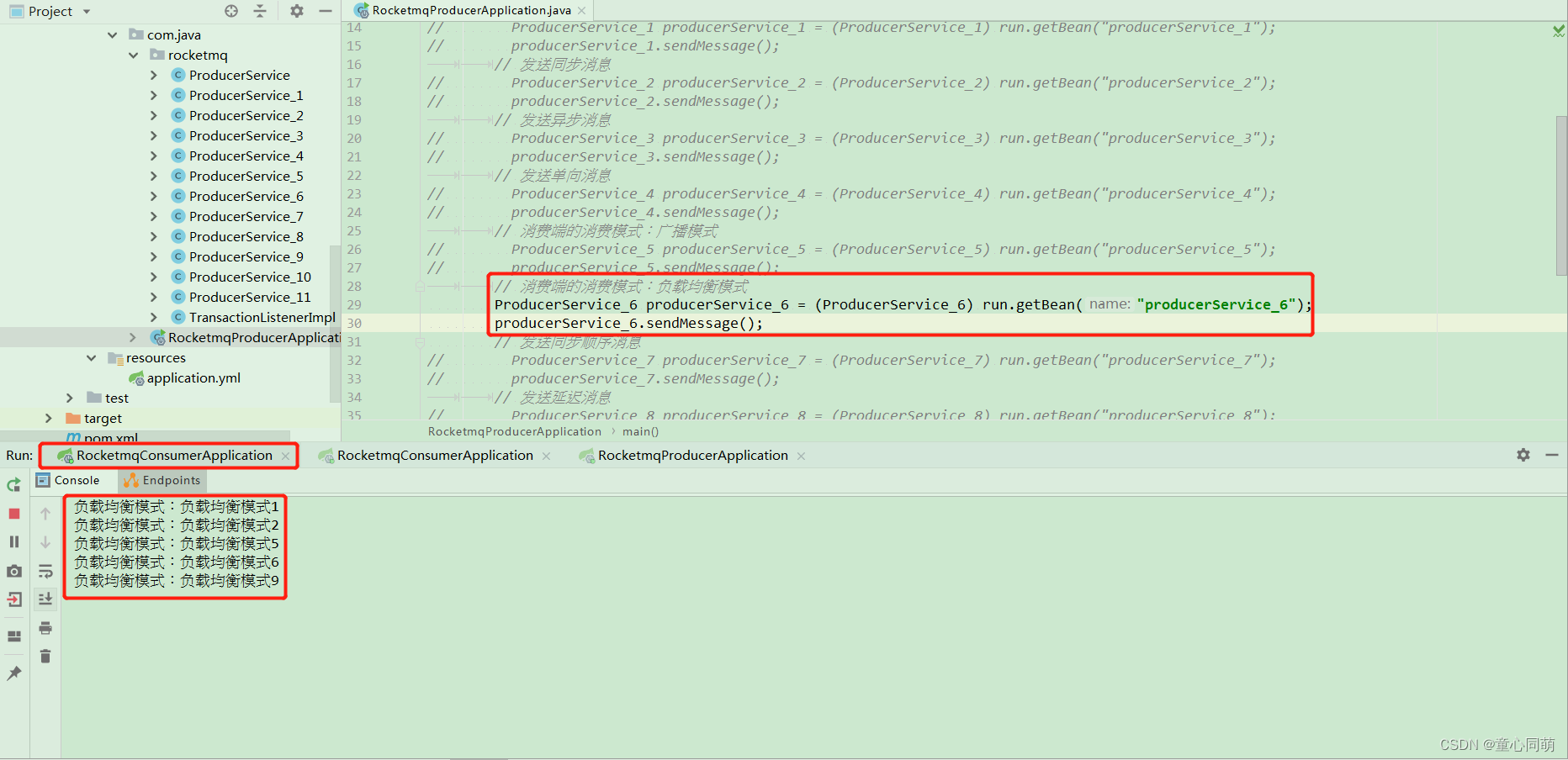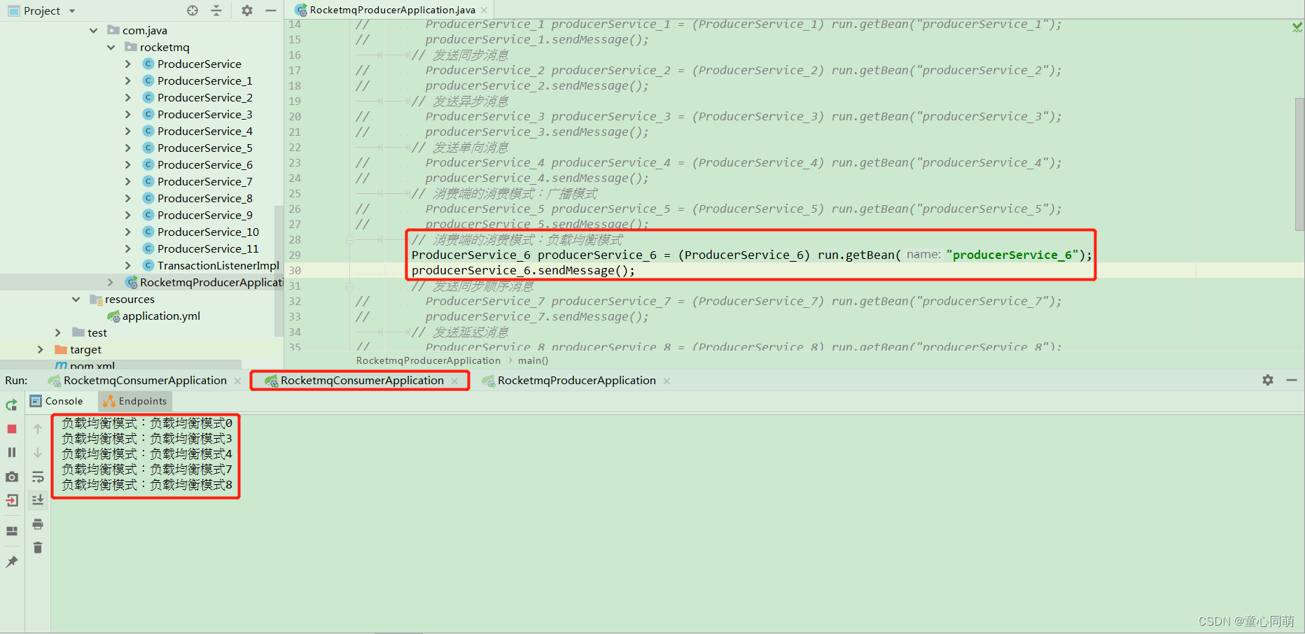 package com.java.rocketmq; import org.apache.rocketmq.spring.core.RocketMQTemplate; import org.springframework.beans.factory.annotation.Autowired; import org.springframework.stereotype.Component; /** * 消息生产者service类 消费端的消费模式:负载均衡模式 * 负载均衡模式是每一个消息只会被某一个消费者消费一次 */ @Component("producerService_6") public class ProducerService_6 { @Autowired private RocketMQTemplate rocketMQTemplate; /** * 消费端的消费模式:负载均衡模式 */ public void sendMessage(){ for(int i=0;i<10;i++){ rocketMQTemplate.convertAndSend("rocketmq_6","负载均衡模式"+i); } } }package com.java.rocketmq; import org.apache.rocketmq.spring.annotation.MessageModel; import org.apache.rocketmq.spring.annotation.RocketMQMessageListener; import org.apache.rocketmq.spring.core.RocketMQListener; import org.springframework.stereotype.Component; /** * 消息消费者service类 消费模式:负载均衡模式 * messageModel = MessageModel.CLUSTERING为负载均衡模式接收消息 * 改变消费者端口号启动多个消费者实例测试消息接收情况 */ @RocketMQMessageListener(topic = "rocketmq_6",consumerGroup = "${rocketmq.consumer.group_6}",messageModel = MessageModel.CLUSTERING) @Component public class ConsumerService_6 implements RocketMQListener<String> { @Override public void onMessage(String message) { System.out.println("负载均衡模式:"+message); } }