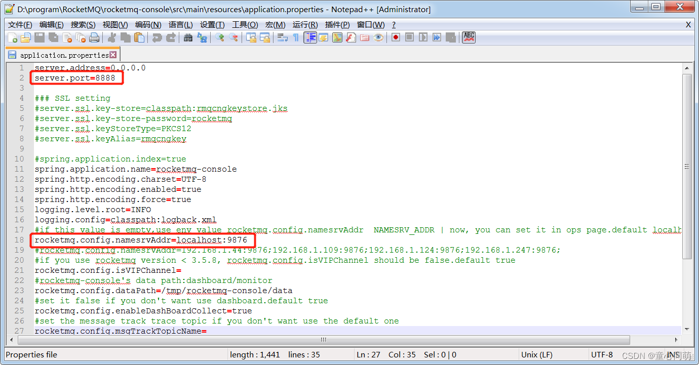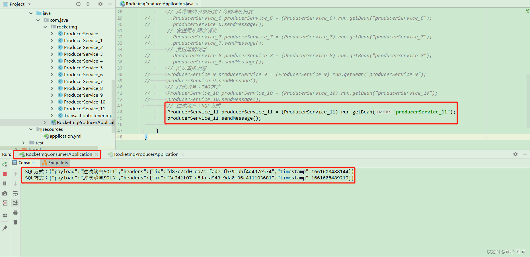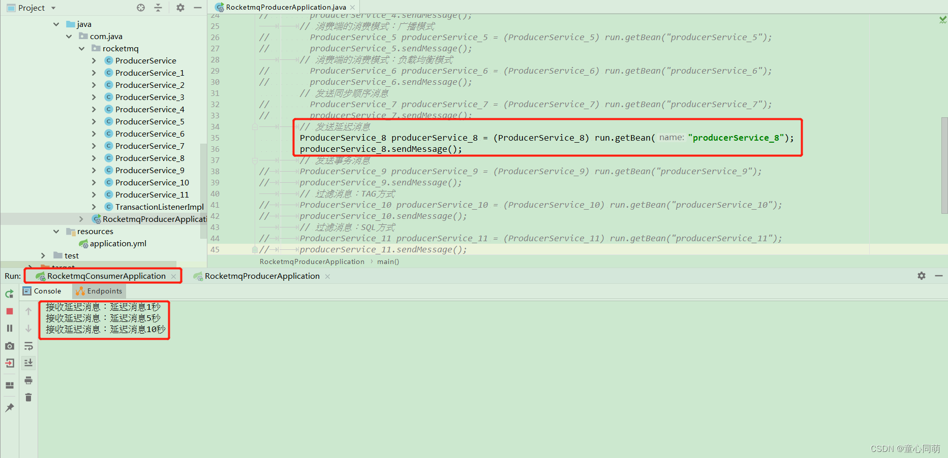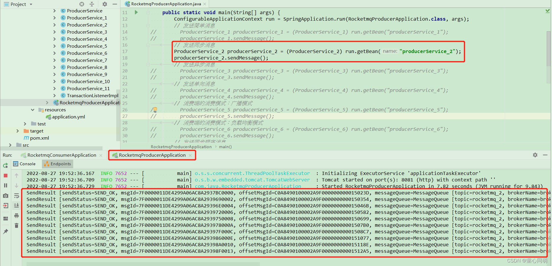 server: port: 8081 servlet: context-path: / rocketmq: name-server: 127.0.0.1:9876 # name-server: 192.168.1.44:9876;192.168.1.109:9876;192.168.1.124:9876;192.168.1.247:9876; producer: group: producer-demo send-message-timeout: 60000 - 子项目rocketmq-provider的启动类