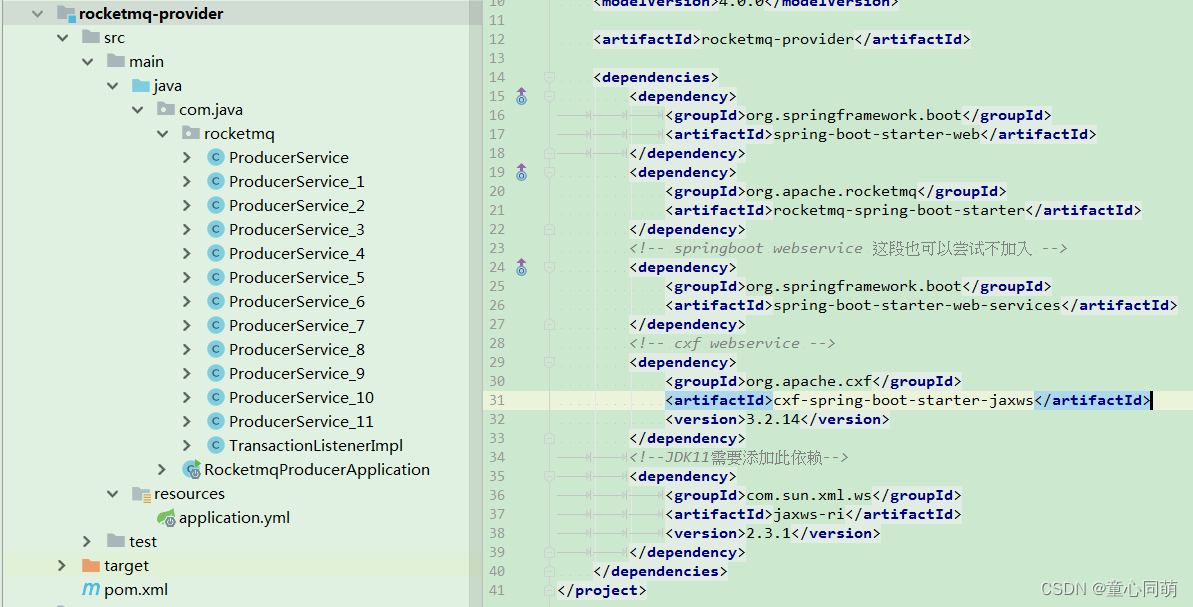 <?xml version="1.0" encoding="UTF-8"?> <project xmlns="http://maven.apache.org/POM/4.0.0" xmlns:xsi="http://www.w3.org/2001/XMLSchema-instance" xsi:schemaLocation="http://maven.apache.org/POM/4.0.0 http://maven.apache.org/xsd/maven-4.0.0.xsd"> <parent> <artifactId>RocketMQ</artifactId> <groupId>com.java</groupId> <version>1.0-SNAPSHOT</version> </parent> <modelVersion>4.0.0</modelVersion> <artifactId>rocketmq-provider</artifactId> <dependencies> <dependency> <groupId>org.springframework.boot</groupId> <artifactId>spring-boot-starter-web</artifactId> </dependency> <dependency> <groupId>org.apache.rocketmq</groupId> <artifactId>rocketmq-spring-boot-starter</artifactId> </dependency> <!-- springboot webservice 这段也可以尝试不加入 --> <dependency> <groupId>org.springframework.boot</groupId> <artifactId>spring-boot-starter-web-services</artifactId> </dependency> <!-- cxf webservice --> <dependency> <groupId>org.apache.cxf</groupId> <artifactId>cxf-spring-boot-starter-jaxws</artifactId> <version>3.2.14</version> </dependency> <!--JDK11需要添加此依赖--> <dependency> <groupId>com.sun.xml.ws</groupId> <artifactId>jaxws-ri</artifactId> <version>2.3.1</version> </dependency> </dependencies> </project> - 子项目rocketmq-provider的application.yml