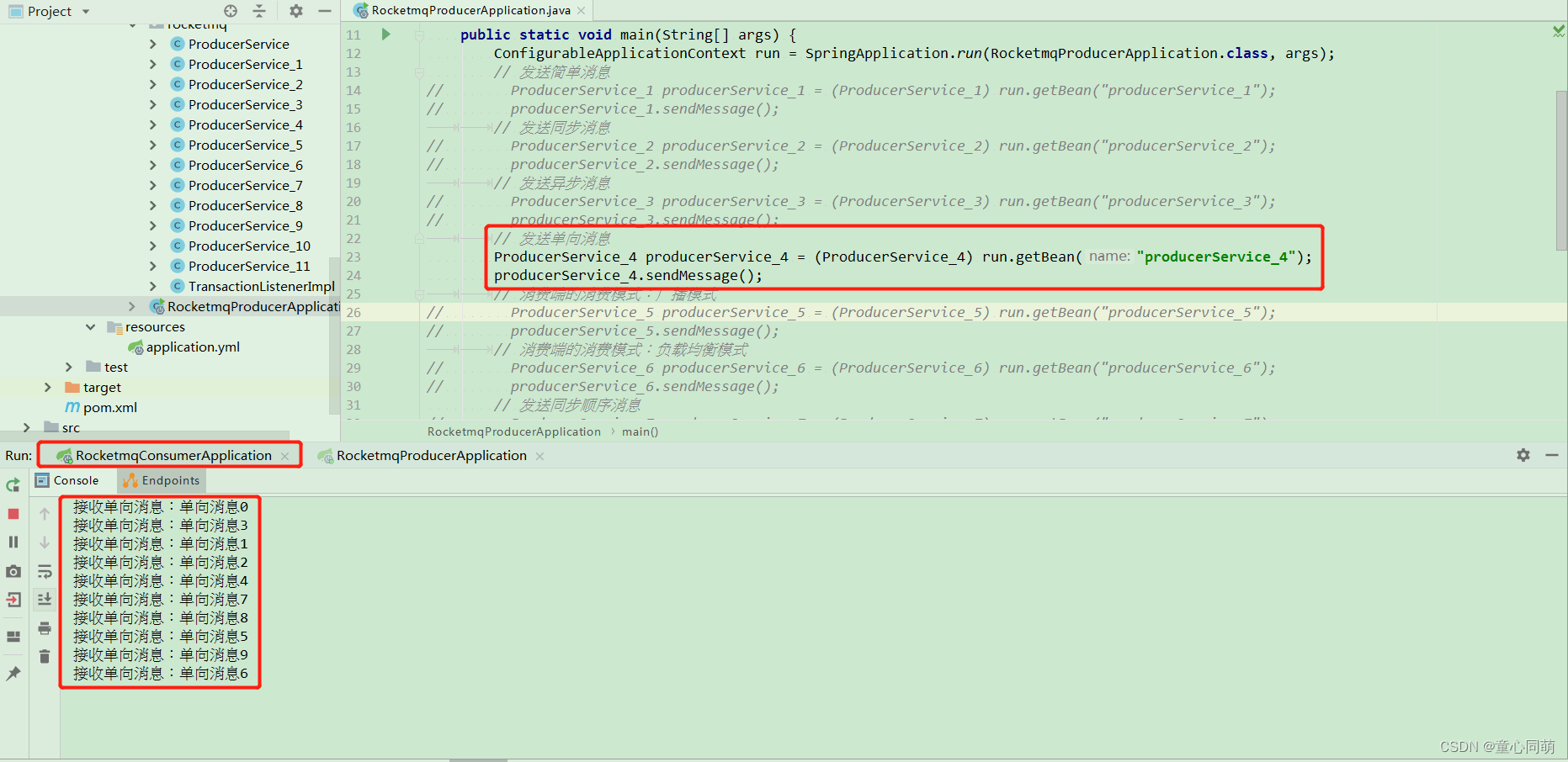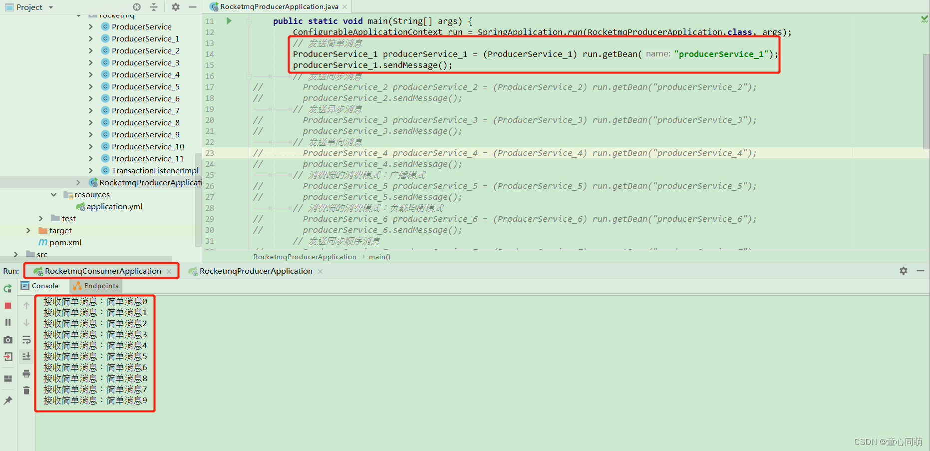 package com.java; import org.springframework.boot.SpringApplication; import org.springframework.boot.autoconfigure.SpringBootApplication; @SpringBootApplication public class RocketmqConsumerApplication { public static void main(String[] args) { SpringApplication.run(RocketmqConsumerApplication.class, args); } } - 消息发送测试:先启动rocketmq-consumer监听消息,后启动rocketmq-provider发送消息