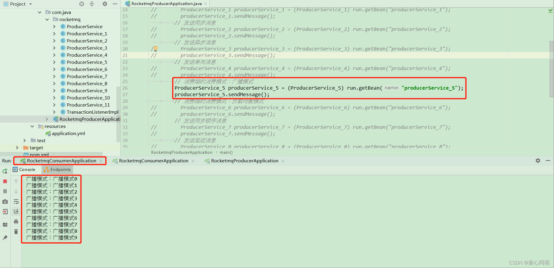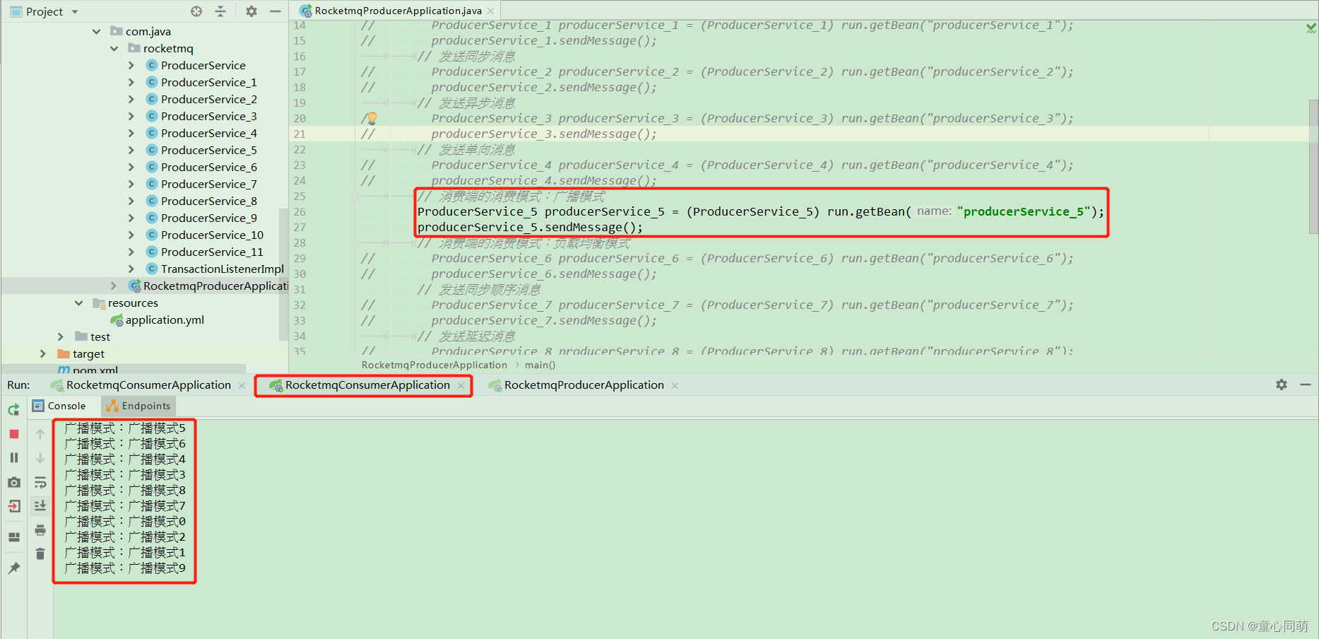 package com.java.rocketmq; import org.apache.rocketmq.spring.core.RocketMQTemplate; import org.springframework.beans.factory.annotation.Autowired; import org.springframework.messaging.Message; import org.springframework.messaging.support.MessageBuilder; import org.springframework.stereotype.Component; import java.util.HashMap; import java.util.Map; /** * 消息生产者service类 消费端的消费模式:广播模式 * 广播模式是每个消费者,都会消费消息 */ @Component("producerService_5") public class ProducerService_5 { @Autowired private RocketMQTemplate rocketMQTemplate; /** * 消费端的消费模式:广播模式 */ public void sendMessage(){ for(int i=0;i<10;i++){ rocketMQTemplate.convertAndSend("rocketmq_5","广播模式"+i); } } }package com.java.rocketmq; import org.apache.rocketmq.spring.annotation.MessageModel; import org.apache.rocketmq.spring.annotation.RocketMQMessageListener; import org.apache.rocketmq.spring.core.RocketMQListener; import org.springframework.stereotype.Component; /** * 消息消费者service类 消费模式:广播模式 * messageModel = MessageModel.BROADCASTING为广播模式接收消息 * 改变消费者端口号启动多个消费者实例测试消息接收情况 */ @RocketMQMessageListener(topic = "rocketmq_5",consumerGroup = "${rocketmq.consumer.group_5}",messageModel = MessageModel.BROADCASTING) @Component public class ConsumerService_5 implements RocketMQListener<String> { @Override public void onMessage(String message) { System.out.println("广播模式:"+message); } }