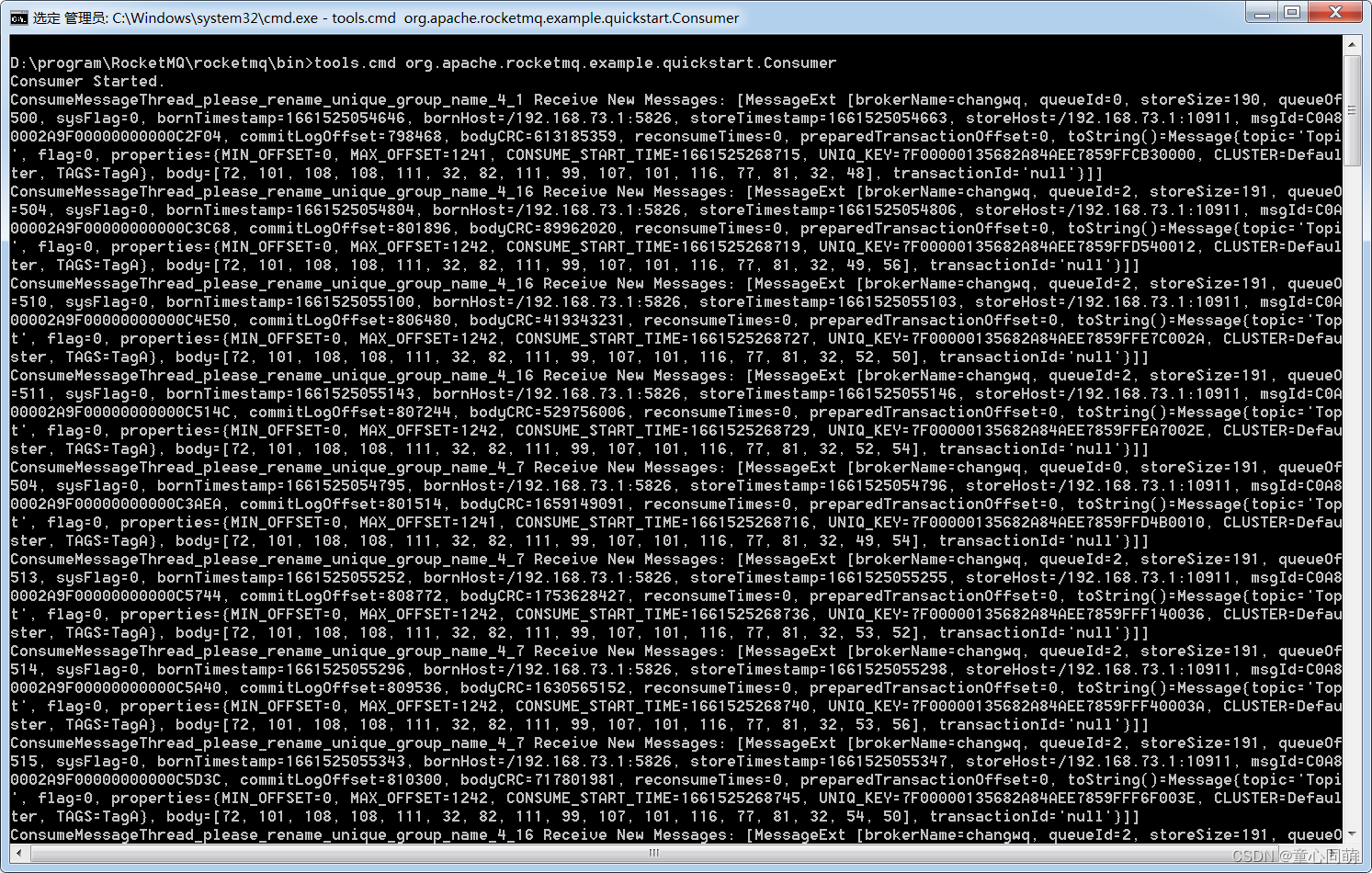 D:\program\RocketMQ\rocketmq\bin>tools.cmd org.apache.rocketmq.example.quickstart.Consumer - RocketMQ控制台启动