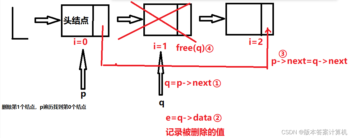删除单链表第i个位置(头结点为第0个位置),与之前相同我们首先要遍历找到第i-1个结点,如删除第1个结点,则要找到第0个结点位置,也就是头结点的位置,如删除第5个结点,则要找到第4个结点的位置,是一个普通结点。