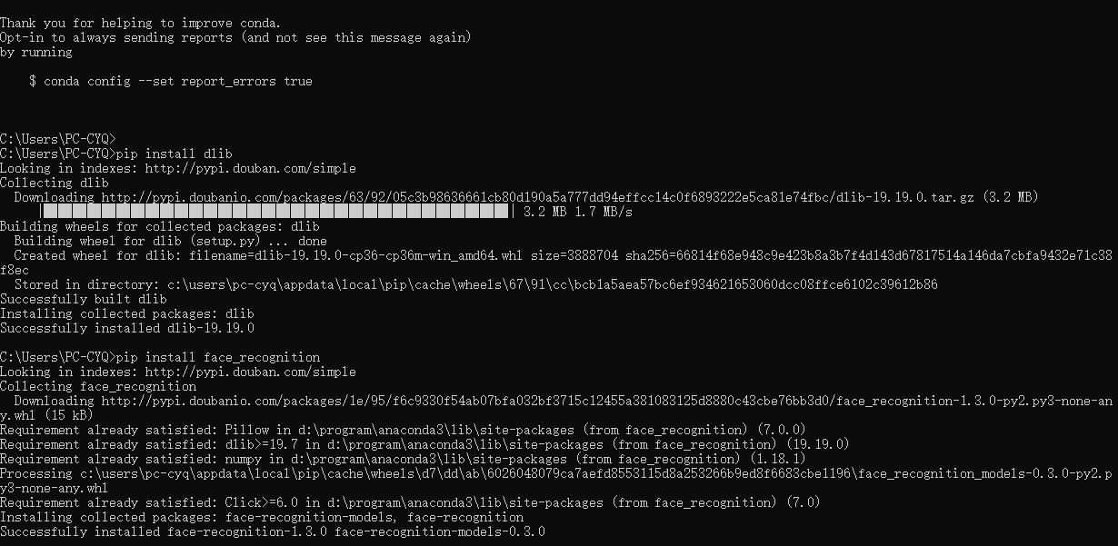 Invoking CMake setup: 'cmake C:\Users\PC-CYQ\AppData\Local\Temp\pip-install-igmqt3oe\dlib\tools\python -DCMAKE_LIBRARY_OUTPUT_DIRECTORY=C:\Users\PC-CYQ\AppData\Local\Temp\pip-install-igmqt3oe\dlib\build\lib.win-amd64-3.6 -DPYTHON_EXECUTABLE=d:\program\anaconda3\python.exe -DCMAKE_LIBRARY_OUTPUT_DIRECTORY_RELEASE=C:\Users\PC-CYQ\AppData\Local\Temp\pip-install-igmqt3oe\dlib\build\lib.win-amd64-3.6 -A x64'