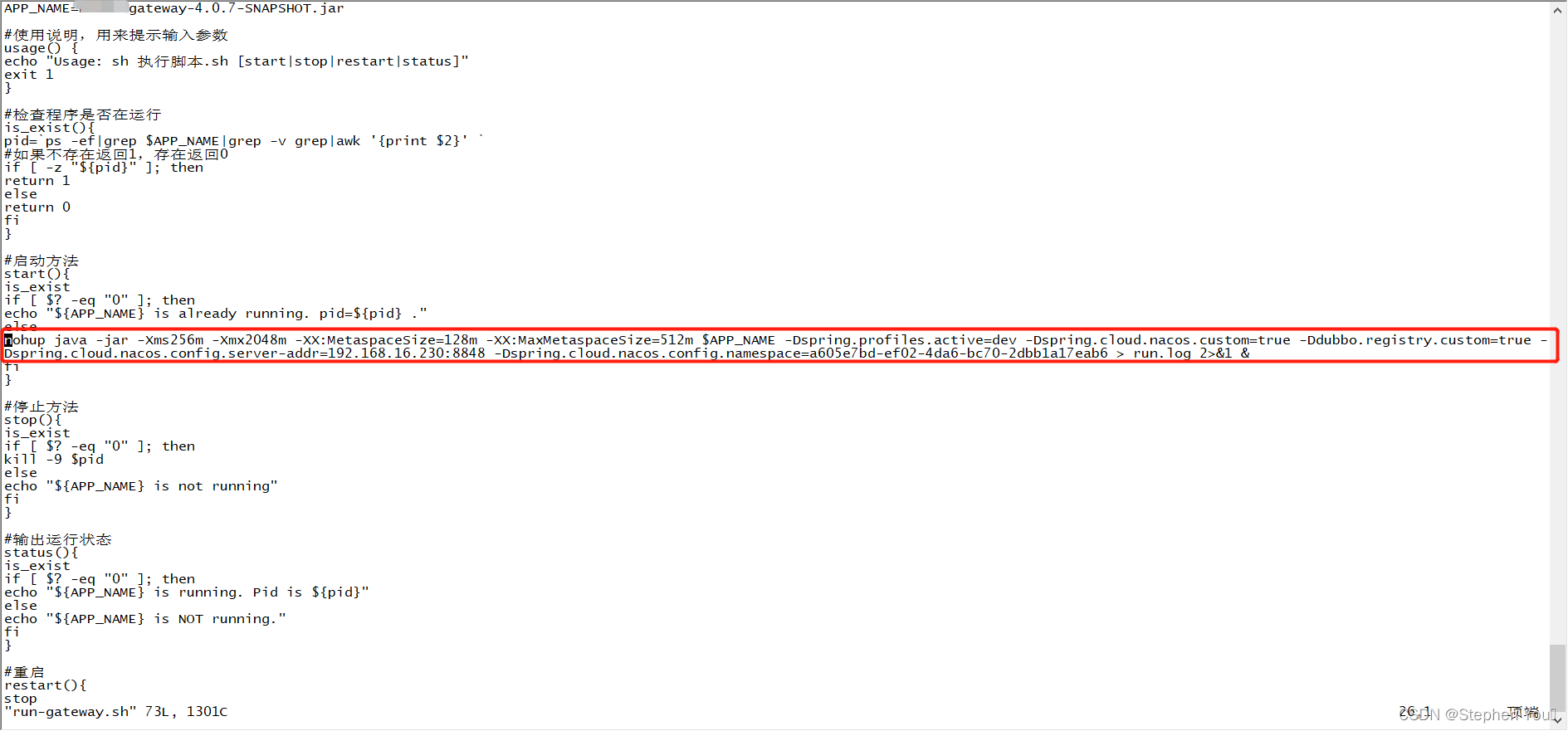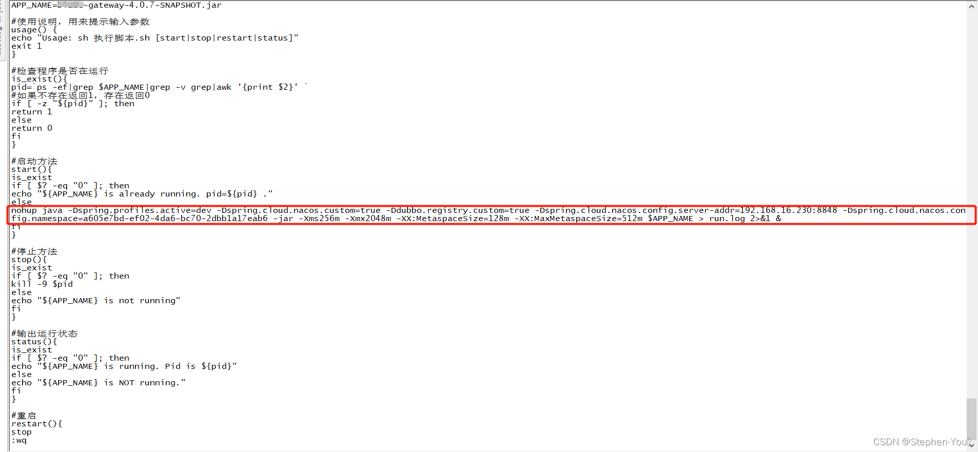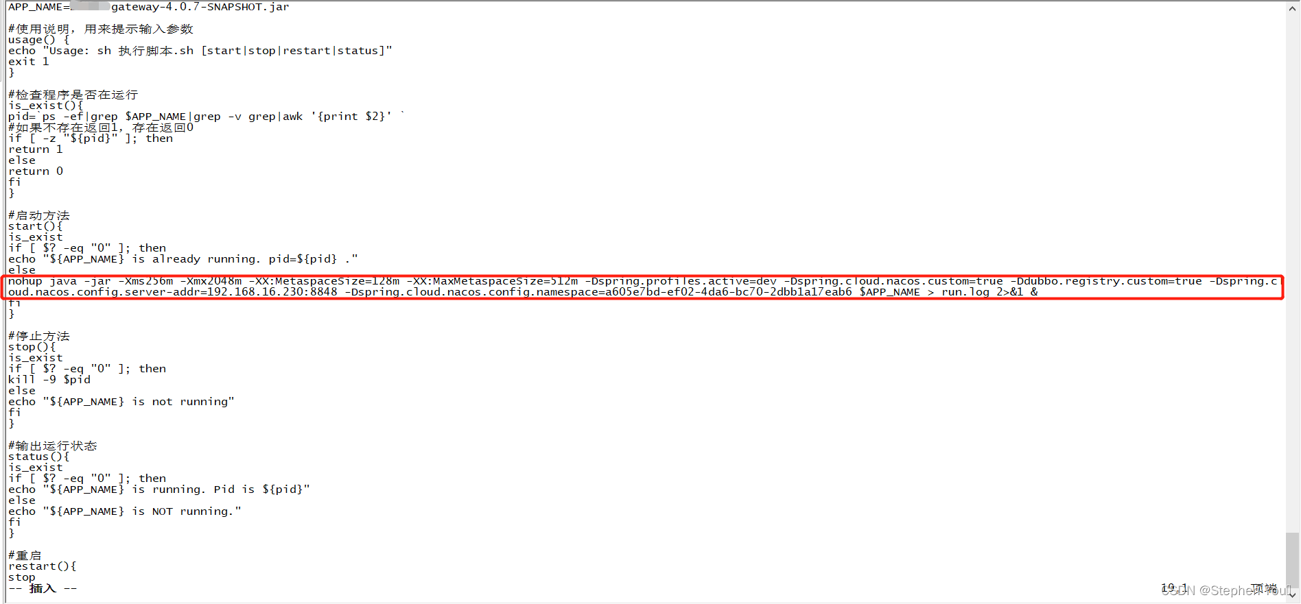 nohup java -jar -Xms256m -Xmx2048m -XX:MetaspaceSize=128m -XX:MaxMetaspaceSize=512m $APP_NAME -Dspring.profiles.active=dev -Dspring.cloud.nacos.custom=true -Ddubbo.registry.custom=true -Dspring.cloud.nacos.config.server-addr=192.168.16.230:8848 -Dspring.cloud.nacos.config.namespace=a605e7bd-ef02-4da6-bc70-2dbb1a17eab6 > run.log 2>&1 &修改为以下两种都可以: