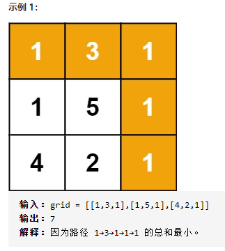 m x n网格grid,请找出一条从左上角到右下角的路径,使得路径上的数字总和为最小。说明:每次只能向下或者向右移动一步。