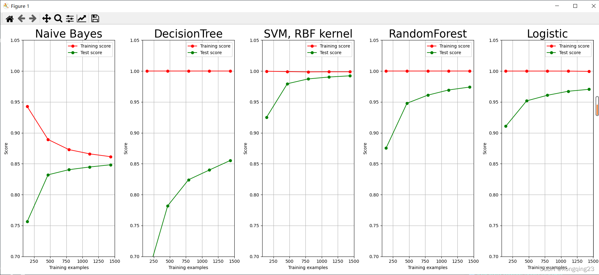 plot_learning_curve(estimator, title_, X, y, ax=axes[ind], ylim=[0.7, 1.05], n_jobs=4, cv=cv)
