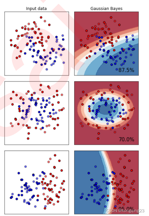 高斯贝叶斯属于比较特殊的一类分类器,其分类效果在二分数据和月亮型数据上表现优秀,但是环形数据不太擅长。我们之前学过的模型中,许多线性模型比如逻辑回归,线性SVM 等等,在线性数据集上会绘制直线决策边界,因此难以对月亮型和环形数据进行区分,但高斯朴素贝叶斯的决策边界是曲线,可以是环形也可以是弧线,所以尽管贝叶斯本身更加擅长线性可分的二分数据,但朴素贝叶斯在环形数据和月亮型数据上也可以有远远胜过其他线性模型的表现。