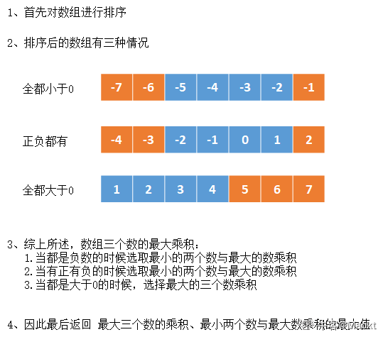 2、如果数组中有正数有负数,则最大乘积既可能是三个最大正数的乘积,也可能是两个最小负数(即绝对值最大)与最大正数的乘积。