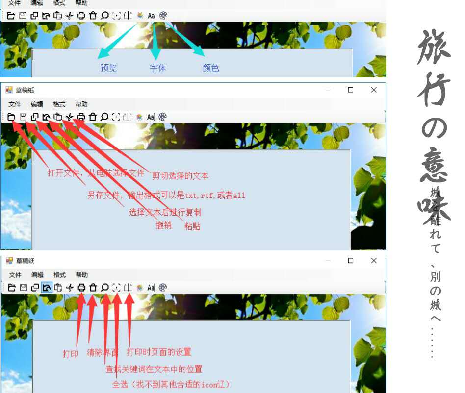 - 敲代码的时候可以仔细一点,我在敲打印这个功能的时候,fontDialog.Front的时候一直报错,最后发现是输入法的错,于是,写代码也是很需要耐心的
