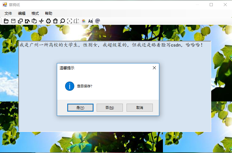 "Rich text files(*.rtf)|*.rtf|Paint text files (*.txt)|*.txt|All files|*.*"这个语句就是设置的支持的文件格式,和打开文件支持的格式相同。这里我多设置了一个提示窗口,提醒用户是否保存文档,其实如果else{}里面的代码就可以实现这个功能了,但是作者还抱着到处点一点玩一玩的心态多做了一点东西,多多益善嘛。