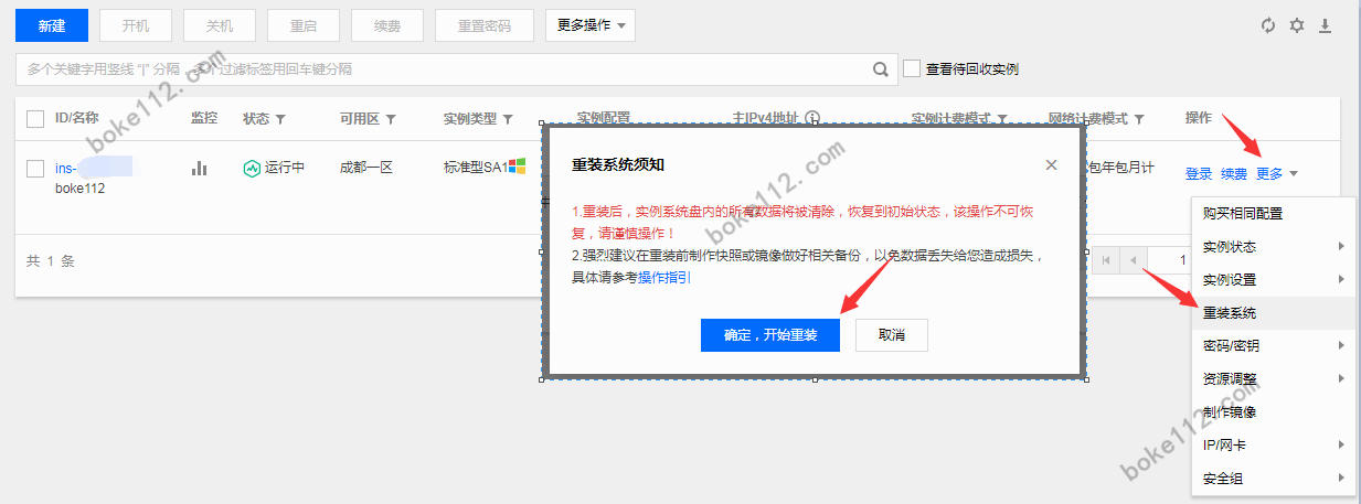 1. 打开腾讯云官网并登录进入控制台 >> 点击“最近访问”栏目中的“云服务器”进入到我们想要更换系统的云服务器 >> 点击实例右侧的“更多 > 重装系统”>> 在弹出的“重装系统须知”对话框中点击【确定,开始重装】按钮。具体见下图: