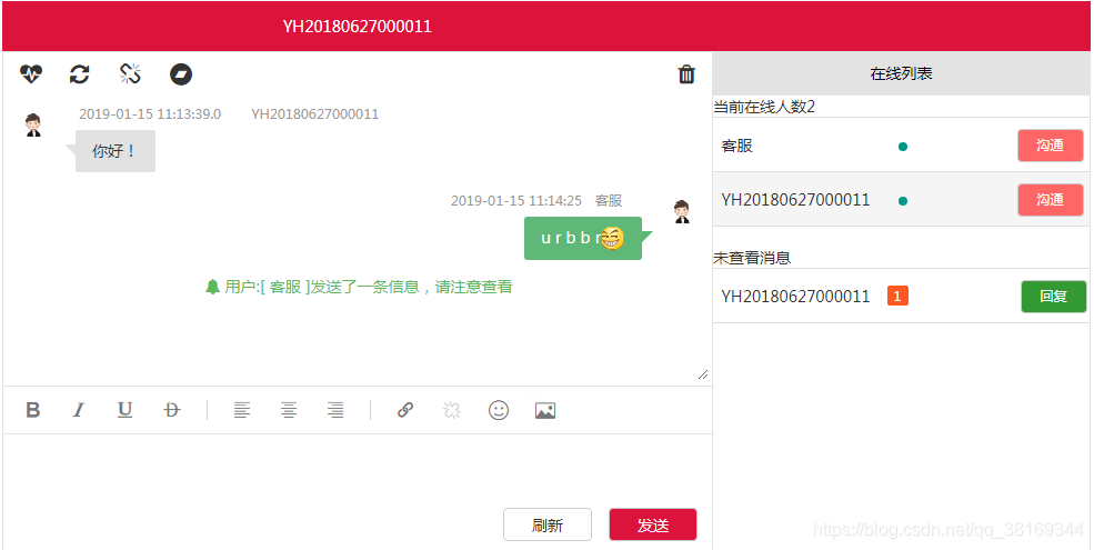 用户端:默认客服,可以查看自己的聊天记录,如果客服没在线则可以相应给出提示,这里只是简单版本