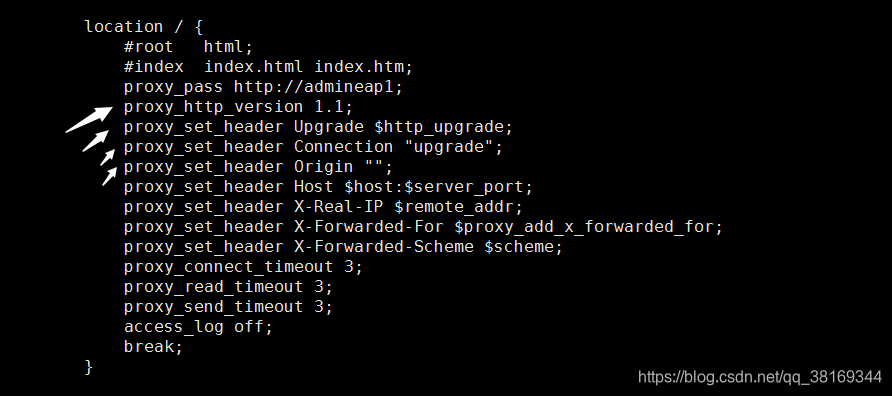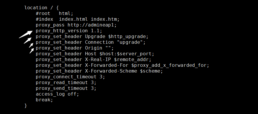 5.如果你的项目搭的nginx 服务上的,还需加上两行配置(在你的nginx.conf 中),这两句的意思是当有websoket请求过来时,自动将http请求升级为socket请求(百度很多,还是贴一下吧)