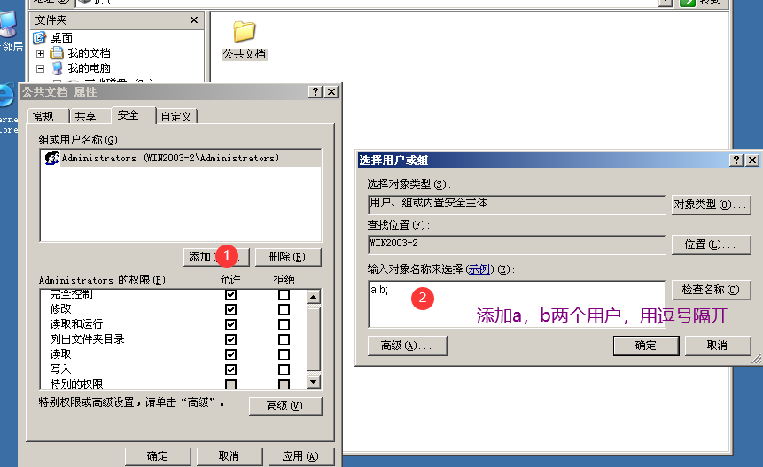 案例:1. 开 2 台虚拟机,并互相 ping 通2. 设置 2003 为共享服务器,并在客户机上可以访问共享,要求 aa 账户只能下载, bb 账户只能上传, cc 账户可以上传下载 及删除