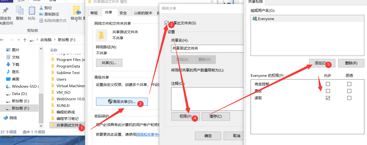 方法:文件夹右键属性 -- 共享 -- 开启共享 -- 设置共享名(不建议用中文) -- 设置共享权限