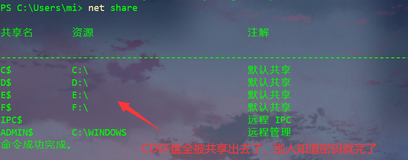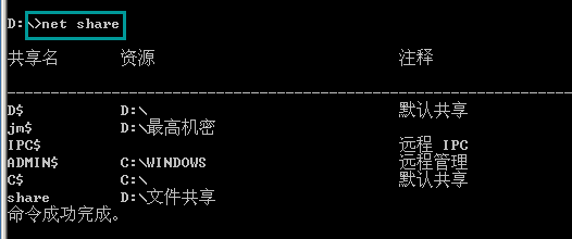 net share#列出共享列表(类比:net user是列出用户列表 net localgroup是列出组列表)IPC$叫空连接(最不安全),最好把这个共享删除。写下\\ip地址\c$再输入你的密码就可以查看你的资料了(这方便微软进行远程管理)net share共享名/del#删除共享net share c$ /del (只是暂时删除——》但是每次开机后又会出现)处理方法1:把net share c$ /del 写进批处理,放到开始启动菜单里面,每次启动就会执行处理方法2:修改注册表,让他每次开机不要自动生成创建共享(用命令行):net share 共享名=共享资源路径案例:共享C盘net share c$=c:\