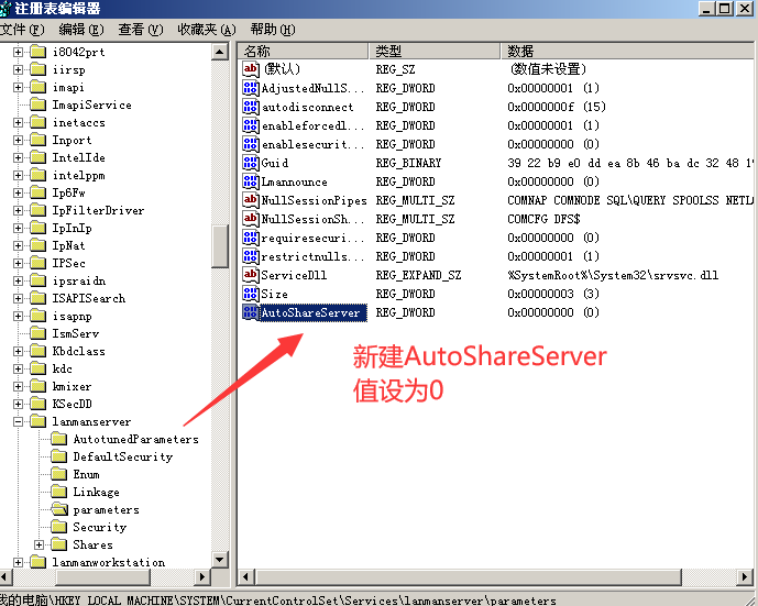 右键新建 REG_DWORD 类型的 AutoShareServer 键,值为 0(0就是关闭自动共享,1是开启)