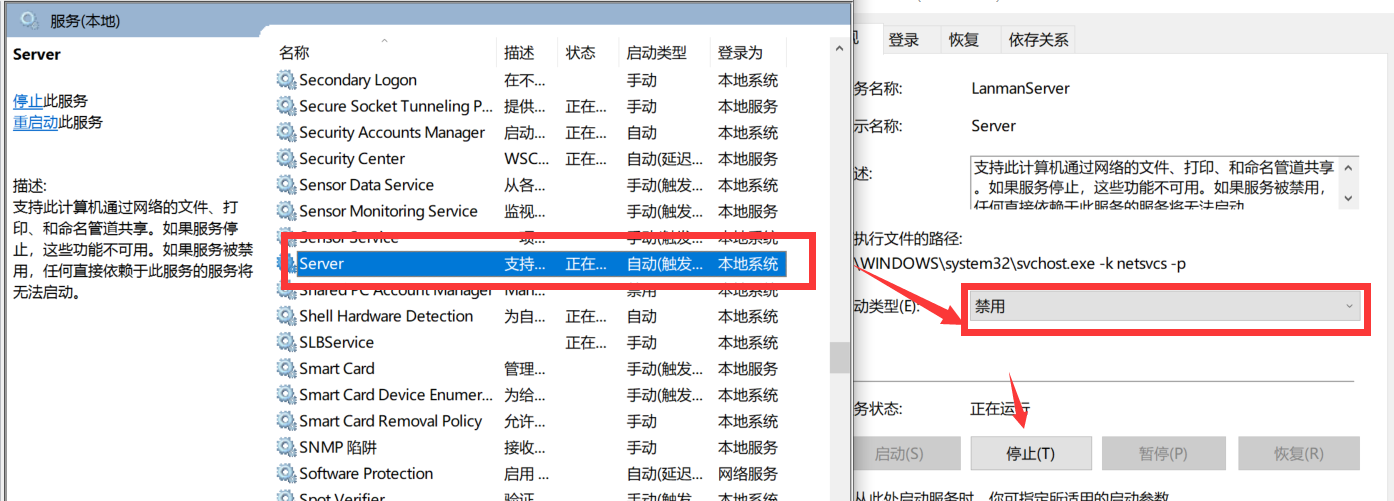 如果属性里面没有“共享”,可能是win10禁用了Server服务:解决方法services.msc启动server服务