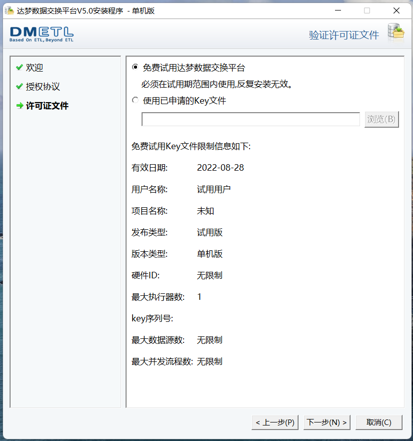 3.点击下一步,验证key文件,用户可以选择【免费试用达梦数据交换平台】选项使用试用版 Key 文件,或者选择【使用已申请的 Key 文件】选项自行添加 Key 文件路径,安装程序将自动验证 Key 文件信息,如果是合法的 Key 文件且在有效期内,用户可以点击【下一步】继续安装,如下图所示: