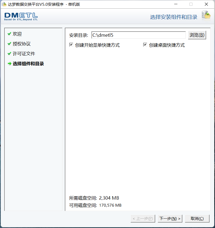 用户可以选择达梦数据交换平台单机版的安装目录。达梦数据交换平台单机版在 Windows 平台默认是安装在 C:\dmetl5 下。