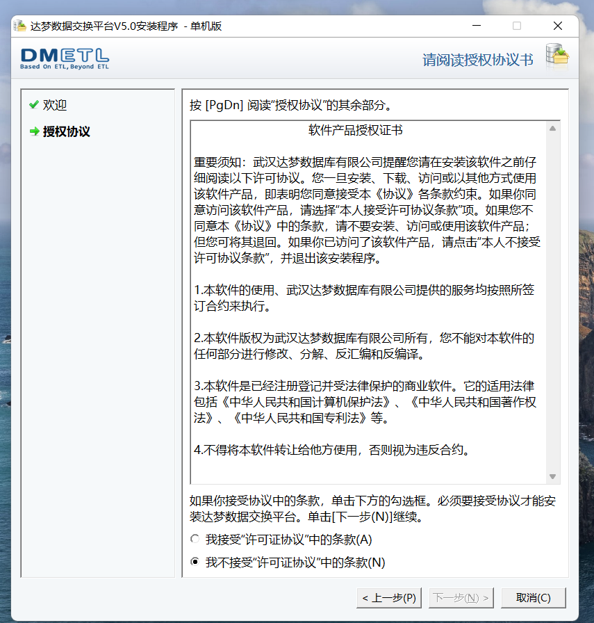 2.点击下一步继续,在安装和使用达梦数据交换平台之前,该安装程序需要用户阅读授权协议条款,用户如接受该协议,则选中【接受】,并点击【下一步】继续安装;用户若选中【不接受】,将无法进行安装,如下图所示: